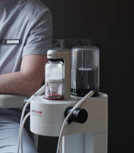 Ортодонтическое лечение усложняет гигиену: налёт и камень скапливаются вокруг дуг, замочков и лигатур. Мы проводим профессиональную чистку с использованием Air Flow Prophylaxis Master — это позволяет: